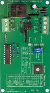 - On board LED's indicate that the board has power, that the input has been operated, that the timer is counting down and that the output is triggered.